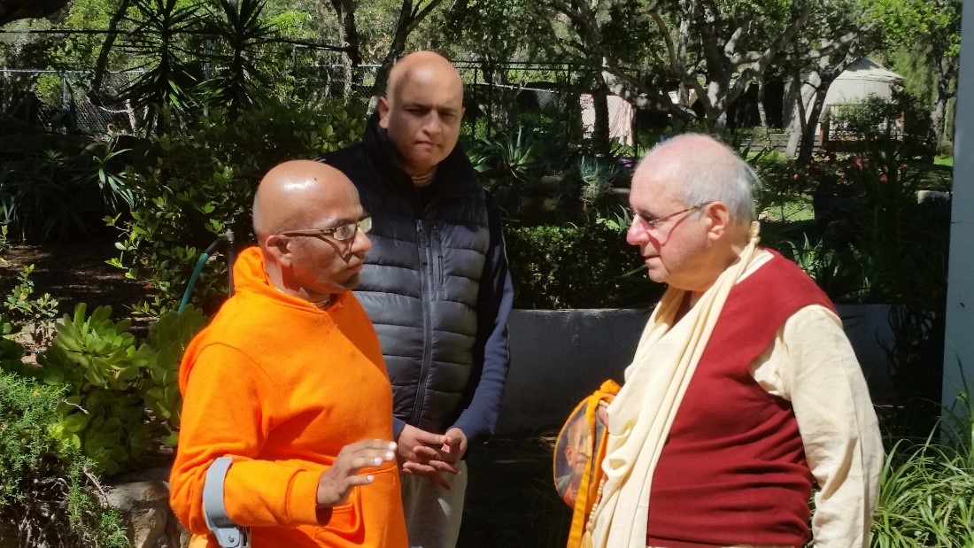 During my travels, I also got the association of many senior devotees who very kindly gave several hours of their time to discuss our philosophy and its practice. One recurrent theme was the challenge of presenting the personal philosophy of bhakti from within what seems like a highly institutionalized religion. Another theme was the strategies for making our message relevant to a highly individualistic audience with post-modern intellectual orientations. Among the devotees whose association I found inspiring were Brahma Tirtha P, a pioneer of mediation in ISKCON; Garuda P, scholar-author on Bhagavad-gita, Bhagavatam and the Bhakti-sutras; Bhakti Marga Maharaj, celebrated as the walking monk for his walking for spiritual awareness across the entire of Canada from one coast to the other; Guru Prasad Maharaj whom I met for the first time in Trinidad; Krishna Dharma P, the author of acclaimed retellings of the Mahabharata and the Ramayana; Srutidharma P, the temple president of the Bhaktivedanta Manor, one of the most successful temples in the Western world; and Tukaram P, a brilliant intellectual and Laguna Beach Temple President.