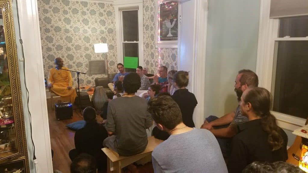 When I was to fly from Seattle to Boston, I got to the airport slightly late and the queue for checking in the luggage was so long that by the time we got through it, the time for boarding the flight had already passed. I had a Wednesday feast program that evening in Boston, but there was no flight to get me there in time. We re-adjusted the booking to a night flight, so that I could give class for the Boston audience via skype. To preclude any transmission problem, we decided that I could give the class in the temple which had a hi-tech facility for doing both YouTube live and Facebook live. When I gave the class, it was streamed through three channels – Skype, YouTube and Facebook. I found myself in a situation I hadn’t encountered before – speaking on a vyasasana to an almost entirely empty temple hall. I decided to keep the class short and we had a lively QA session not just with the devotees in the Boston temple hall but also several of the devotees from Seattle who too had joined online. (As it was afternoon in Seattle, most of them couldn’t come).