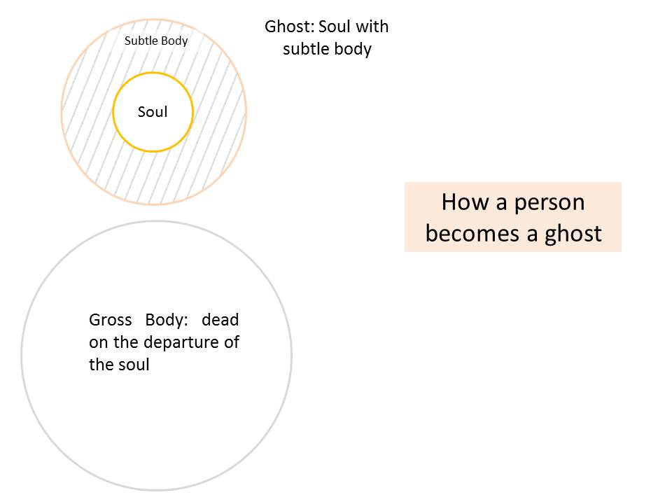 At the time of death the soul accompanied by the subtle body leaves the gross body. Â Normally, the soul gets a new gross body according to its karma. But in exceptional cases when the soul does not get a next gross body, then it stays in a disembodied state. Souls living this disembodied existence are called ghosts.